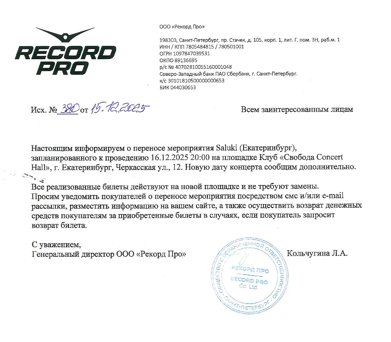 Уважаемый клиент! Спешим сообщить, что по информации, полученной от организатора, концерт Saluki, запланированный на 16 декабря 2025 года в 20:00 в клубе «Свобода», перенесён на открытую дату. Новая дата концерта будет объявлена дополнительно. Ранее приобретенные билеты действительны на новую дату, обменивать их не нужно. Если вам неудобно посетить концерт в новую дату, вы можете вернуть билет по кнопке в личном кабинете во вкладке «Заказы» (до 31 января 2026 года включительно). Деньги за электронные билеты вернутся автоматически в полном объёме на карту, с которой была произведена оплата. Если вы купили билет в кассе Ticketland.ru за наличный расчет, то обратитесь, пожалуйста, на почту: vozvrat@ticketland.ru. С уважением, команда поддержки Ticketland.
