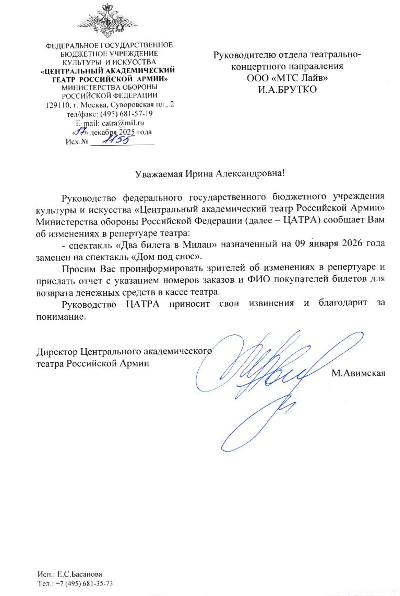 Уважаемый клиент! Спешим сообщить, что по информации, полученной от организатора, спектакль «Два билета в Милан», запланированный на 9 января 2026 года в 19:00 в Театре Российской Армии, заменен на спектакль «Дом под снос». Ранее приобретенные билеты действительны на новый спектакль, обменивать их не нужно. По всем вопросам просьба обращаться в театр по номеру телефона: +7 (495) 681-35-73 и электронной почте: sales@teatrarmii.ru. С уважением, команда поддержки Ticketland.