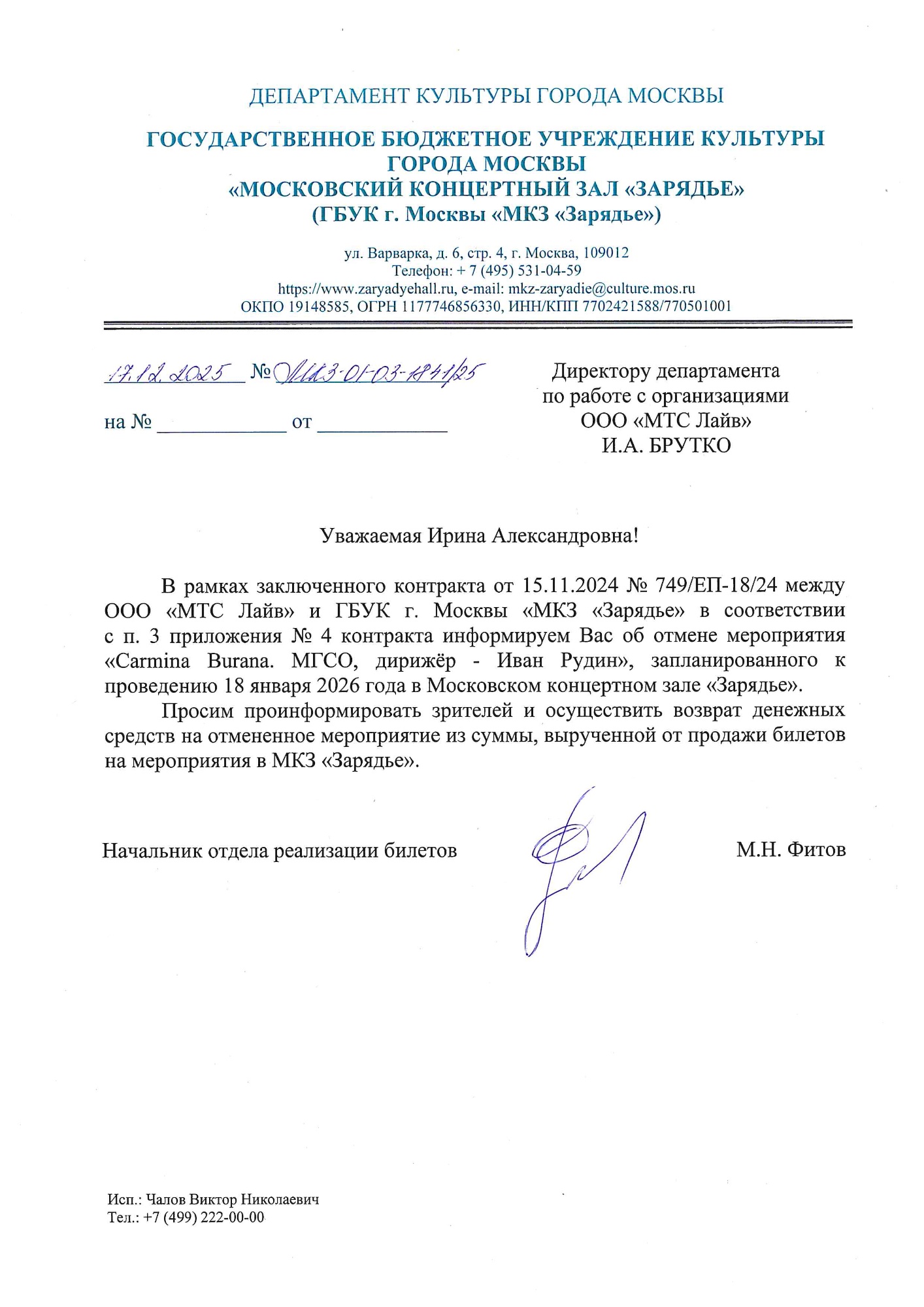 Уважаемый клиент! Спешим сообщить, что по информации, полученной от организатора, концерт «Carmina Burana. МГСО, дирижёр – Иван Рудин», запланированный на 18 января 2026 года в 19:00 в МКЗ «Зарядье», отменён. Деньги за электронные билеты вернутся автоматически в полном объёме на карту, с которой была произведена оплата. Если вы купили билет в кассе Ticketland.ru за наличный расчет, то обратитесь, пожалуйста, на почту: vozvrat@ticketland.ru. С уважением, команда поддержки Ticketland.
