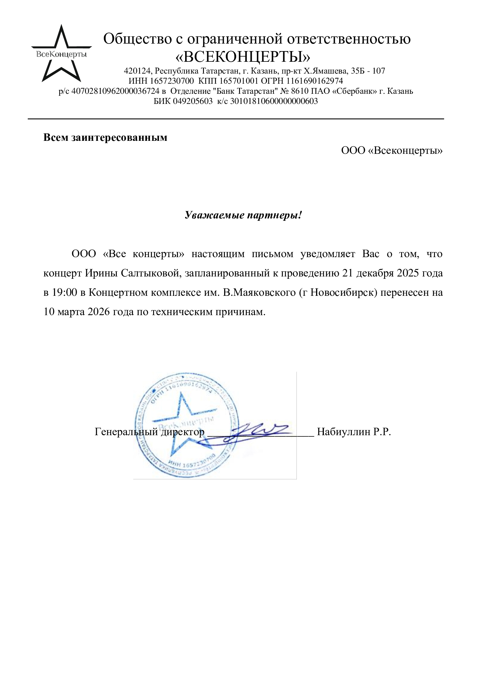 Уважаемый клиент! Спешим сообщить, что по информации, полученной от организатора, большой сольный концерт Ирины Салтыковой, запланированный на 21 декабря 2025 года в 19:00 в Концертном комплексе имени Маяковского, перенесён на 10 марта 2026 года, начало в 19:00. Ранее приобретенные билеты действительны на новую дату, обменивать их не нужно. Если вам неудобно посетить концерт в новую дату, вы можете вернуть билет по кнопке в личном кабинете во вкладке «Заказы» (до 31 декабря 2025 года включительно). Деньги за электронные билеты вернутся автоматически в полном объёме на карту, с которой была произведена оплата. Если вы купили билет в кассе Ticketland.ru за наличный расчет, то обратитесь, пожалуйста, на почту: vozvrat@ticketland.ru. С уважением, команда поддержки Ticketland.