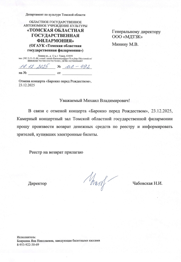 Уважаемый клиент! Спешим сообщить, что по информации, полученной от организатора, концерт «Барокко перед Рождеством», запланированный на 23 декабря 2025 года в Томской областной филармонии, отменён. Деньги за электронные билеты вернутся автоматически в полном объёме на карту, с которой была произведена оплата. Если вы купили билет в кассе Ticketland.ru за наличный расчет, то обратитесь, пожалуйста, на почту: vozvrat@ticketland.ru. С уважением, команда поддержки Ticketland