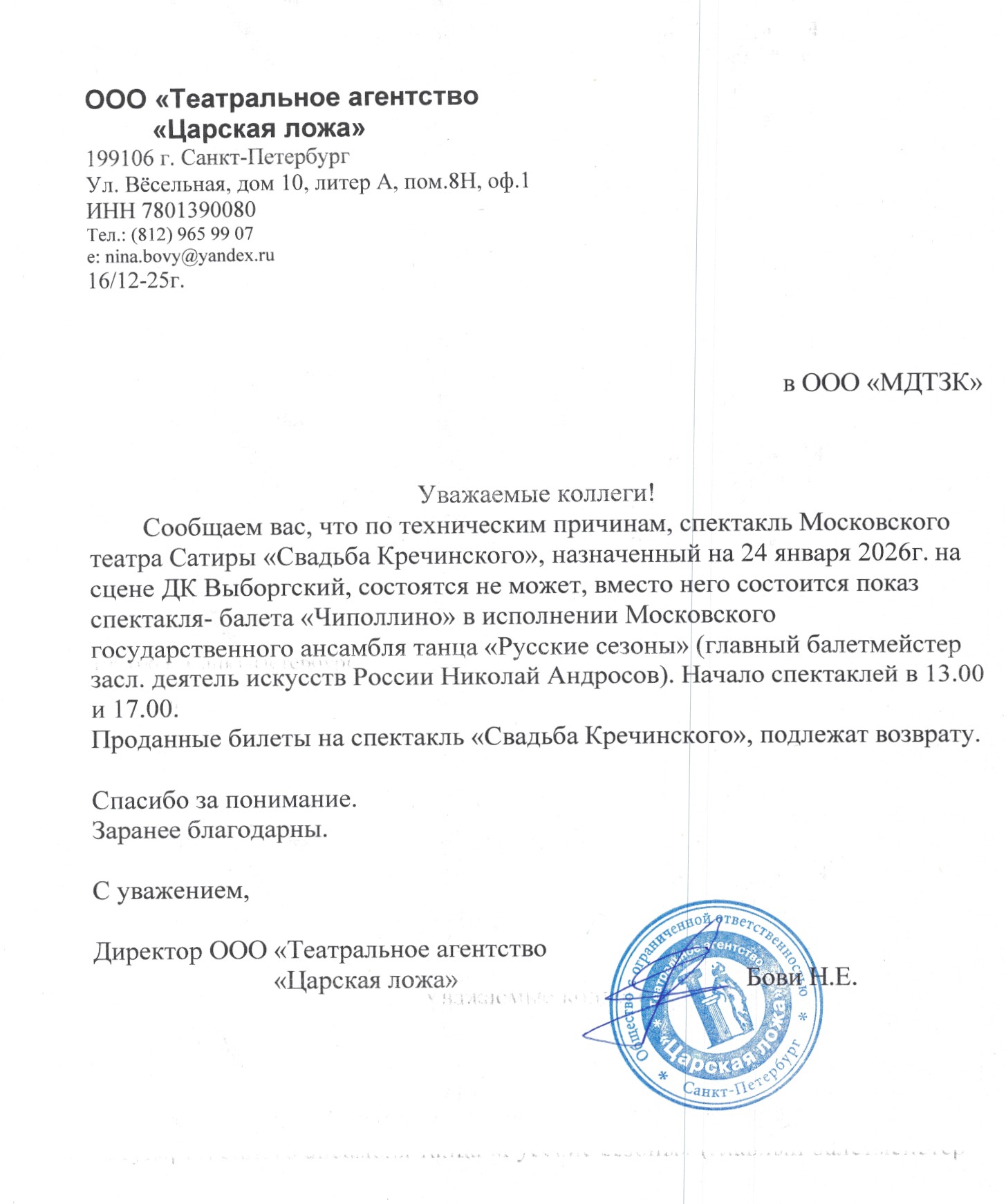 Уважаемый клиент! Спешим сообщить, что по информации, полученной от организатора, спектакль «Свадьба Кречинского». Московский театр Сатиры, запланированный на 24 января 2026 года в 19:00 в Выборгском Дворце культуры, отменён. Деньги за электронные билеты вернутся автоматически в полном объёме на карту, с которой была произведена оплата. Если вы купили билет в кассе Ticketland.ru за наличный расчет, то обратитесь, пожалуйста, на почту: vozvrat@ticketland.ru. С уважением, команда поддержки Ticketland.