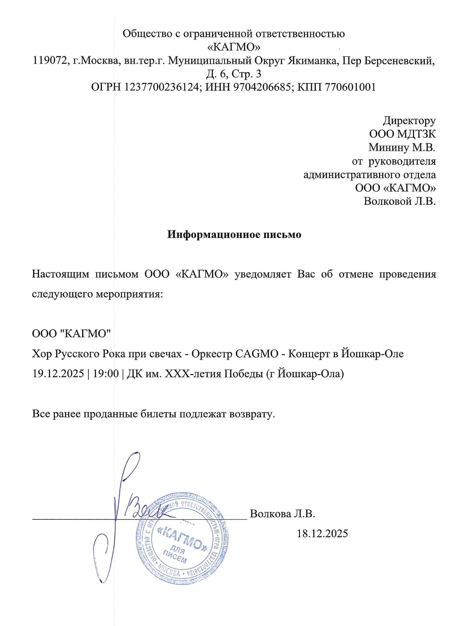 Уважаемый клиент! Спешим сообщить, что по информации, полученной от организатора, концерт «Оркестр CAGMO. Хор русского рока при свечах», запланированный на 19 декабря 2025 года в 19:00 во Дворце культуры имени XXX-я Победы, отменён. Деньги за электронные билеты вернутся автоматически в полном объёме на карту, с которой была произведена оплата. Если вы купили билет в кассе Ticketland.ru за наличный расчет, то обратитесь, пожалуйста, на почту: vozvrat@ticketland.ru. С уважением, команда поддержки Ticketland.