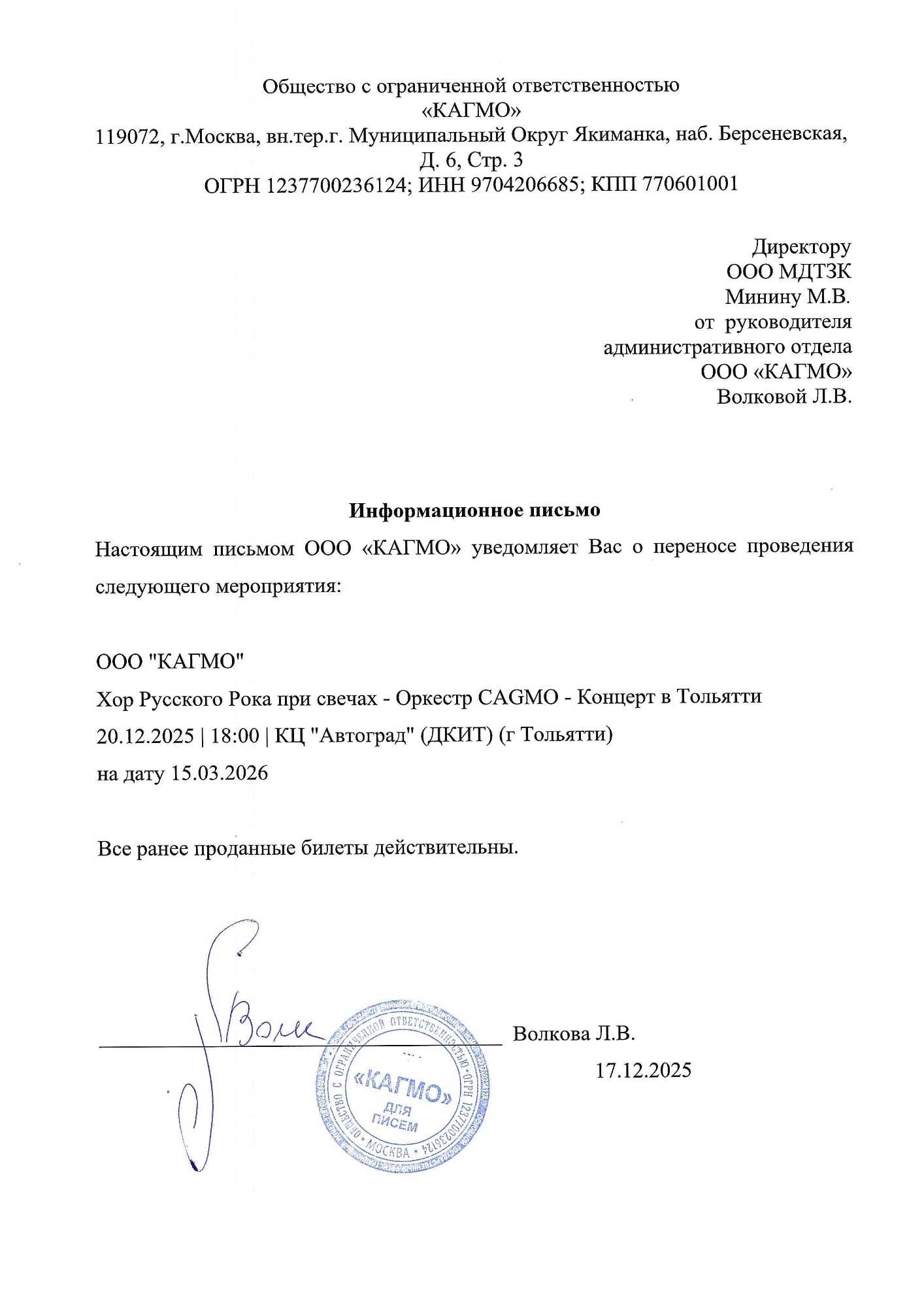 Уважаемый клиент! Спешим сообщить, что по информации, полученной от организатора, концерт «Оркестр CAGMO. Хор русского рока при свечах», запланированный на 20 декабря 2025 года в 18:00 в КЦ «Автоград», перенесён на 15 марта 2026 года, начало в 18:00. Ранее приобретенные билеты действительны на новую дату, обменивать их не нужно. Если вам неудобно посетить концерт в новую дату, вы можете вернуть билет по кнопке в личном кабинете во вкладке «Заказы» (до 15.03.26 18:00). Деньги за электронные билеты вернутся автоматически в полном объёме на карту, с которой была произведена оплата. Если вы купили билет в кассе Ticketland.ru за наличный расчет, то обратитесь, пожалуйста, на почту: vozvrat@ticketland.ru. С уважением, команда поддержки Ticketland.