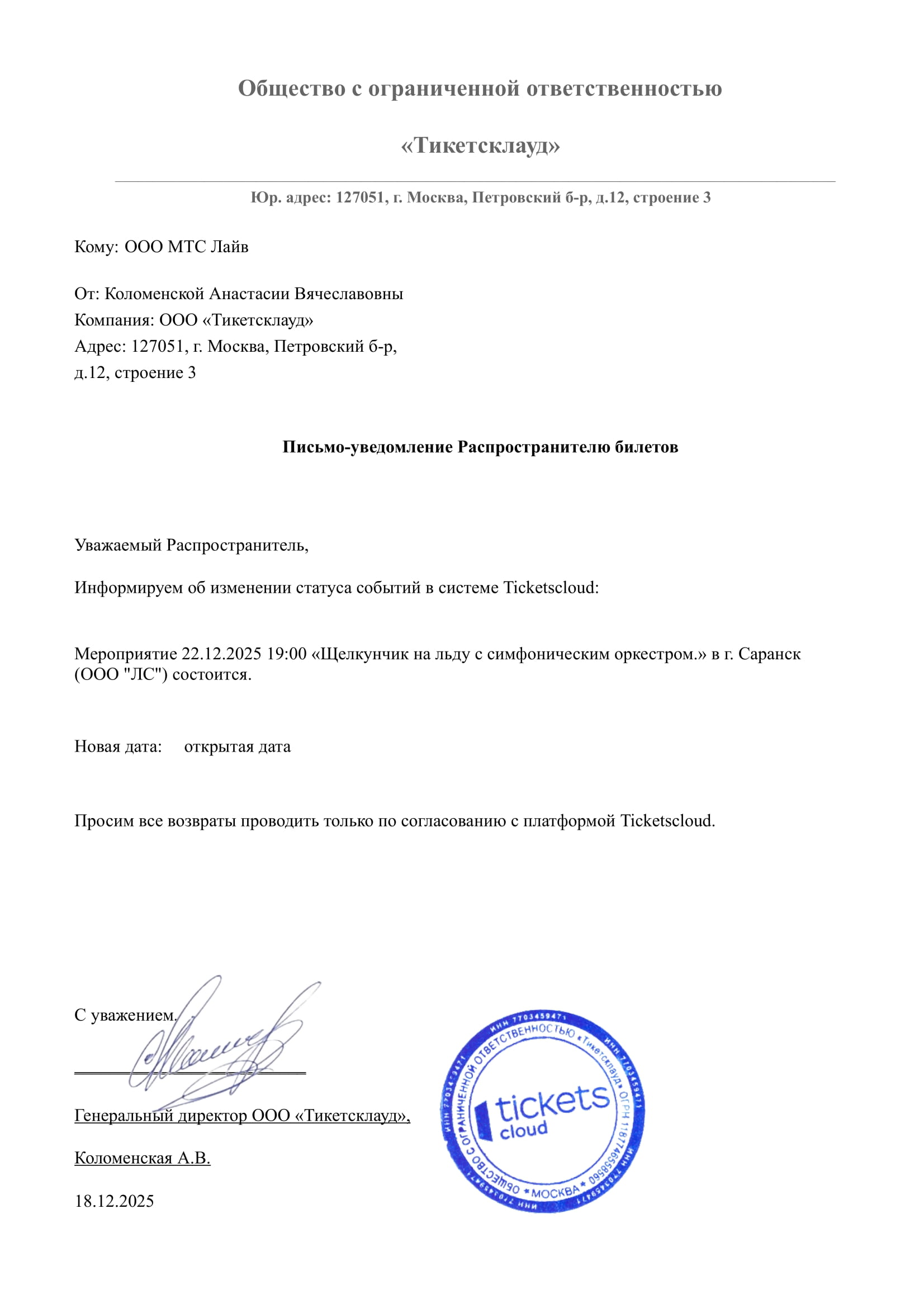 Уважаемый клиент! Спешим сообщить, что по информации, полученной от организатора, спектакль «Щелкунчик на льду с симфоническим оркестром», запланированный на 22 декабря 2025 года в 15:00 в Ледовом дворце, перенесён на открытую дату. Ранее приобретенные билеты действительны на новую дату, обменивать их не нужно. Об условиях возврата будет объявлено дополнительно. С уважением, команда поддержки Ticketland.