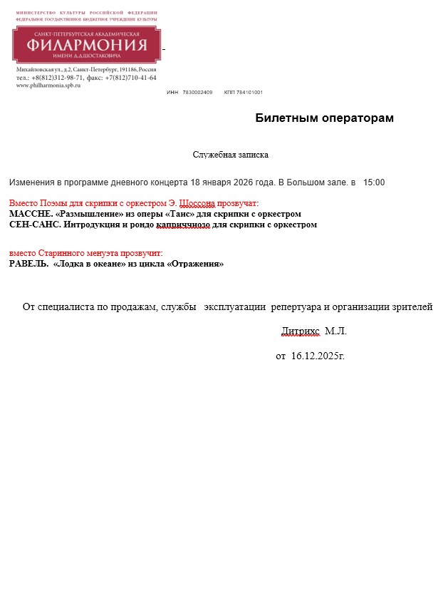 Уважаемый клиент! Спешим сообщить, что по информации, полученной от организатора, в концерте «ЗКР, Э. Ледюк-Баром», запланированном на 18 января 2026 года в 15:00 в большом зале филармонии, произошли изменения в программе. Вместо «Поэмы для скрипки с оркестром» Э. Шоссона прозвучат: Массне. «Размышление» из оперы «Таис» для скрипки с оркестром и Сен-Санс. «Интродукция и рондо каприччиозо для скрипки с оркестром». Вместо «Старинного менуэта» прозвучит: Равель. «Лодка в океане» из цикла «Отражения». Ранее приобретенные билеты действительны, обменивать их не нужно. Если вы не хотите посетить мероприятие, вернуть билет можно по кнопке в личном кабинете во вкладке «Заказы» (до 18 января 2026 года 15:00). Деньги за электронные билеты вернутся автоматически в полном объёме на карту, с которой была произведена оплата. Если вы купили билет в кассе Ticketland.ru за наличный расчет, то обратитесь, пожалуйста, на почту: vozvrat@ticketland.ru. С уважением, команда поддержки Ticketland
