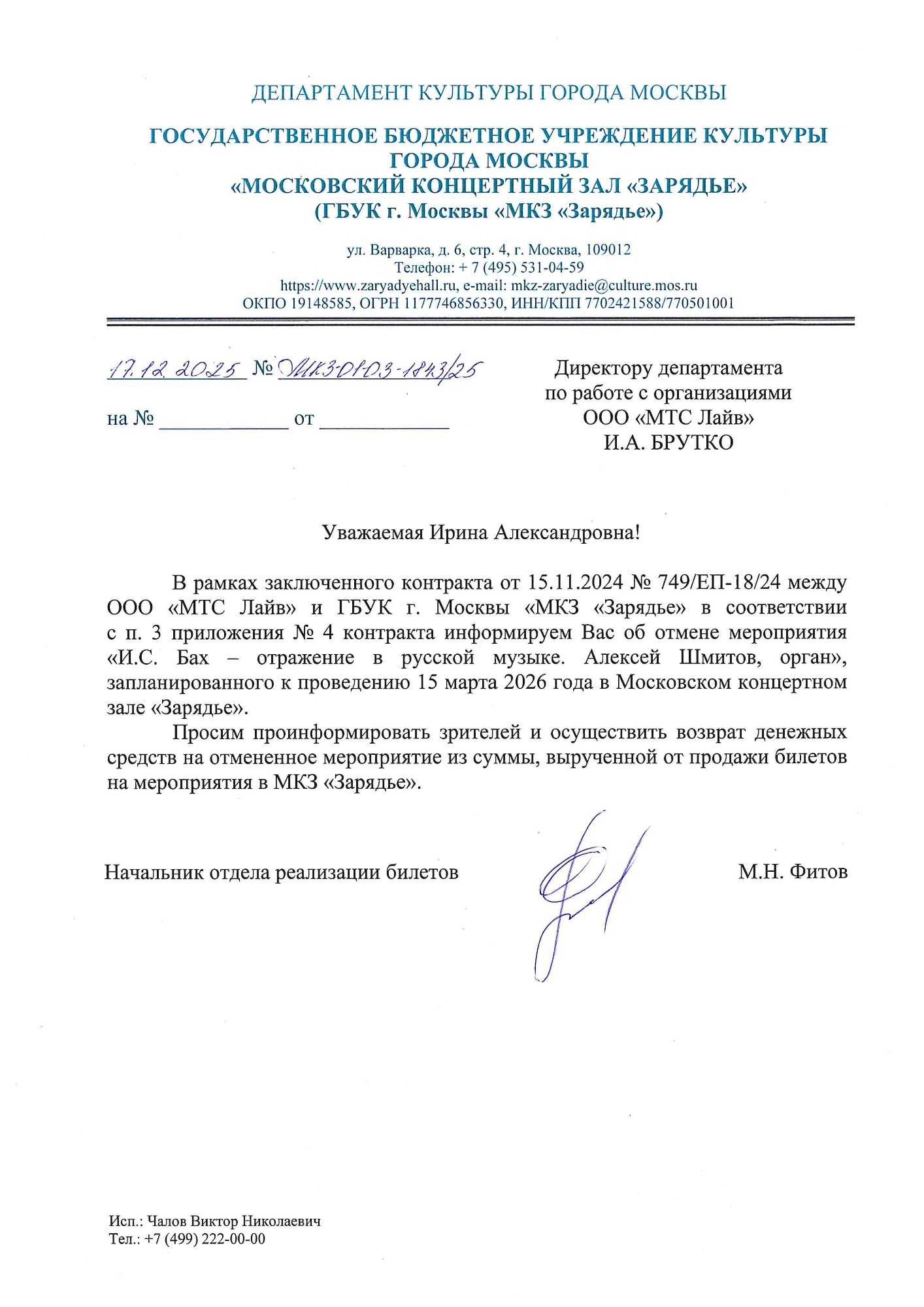 Уважаемый клиент! Спешим сообщить, что по информации, полученной от организатора, концерт Алексея Шмитова «И.С. Бах – отражение в русской музыке», запланированный на 15 марта 2026 года в 13:00 в МКЗ «Зарядье», отменён. Деньги за электронные билеты вернутся автоматически в полном объёме на карту, с которой была произведена оплата. Если вы купили билет в кассе Ticketland.ru за наличный расчет, то обратитесь, пожалуйста, на почту: vozvrat@ticketland.ru. С уважением, команда поддержки Ticketland.