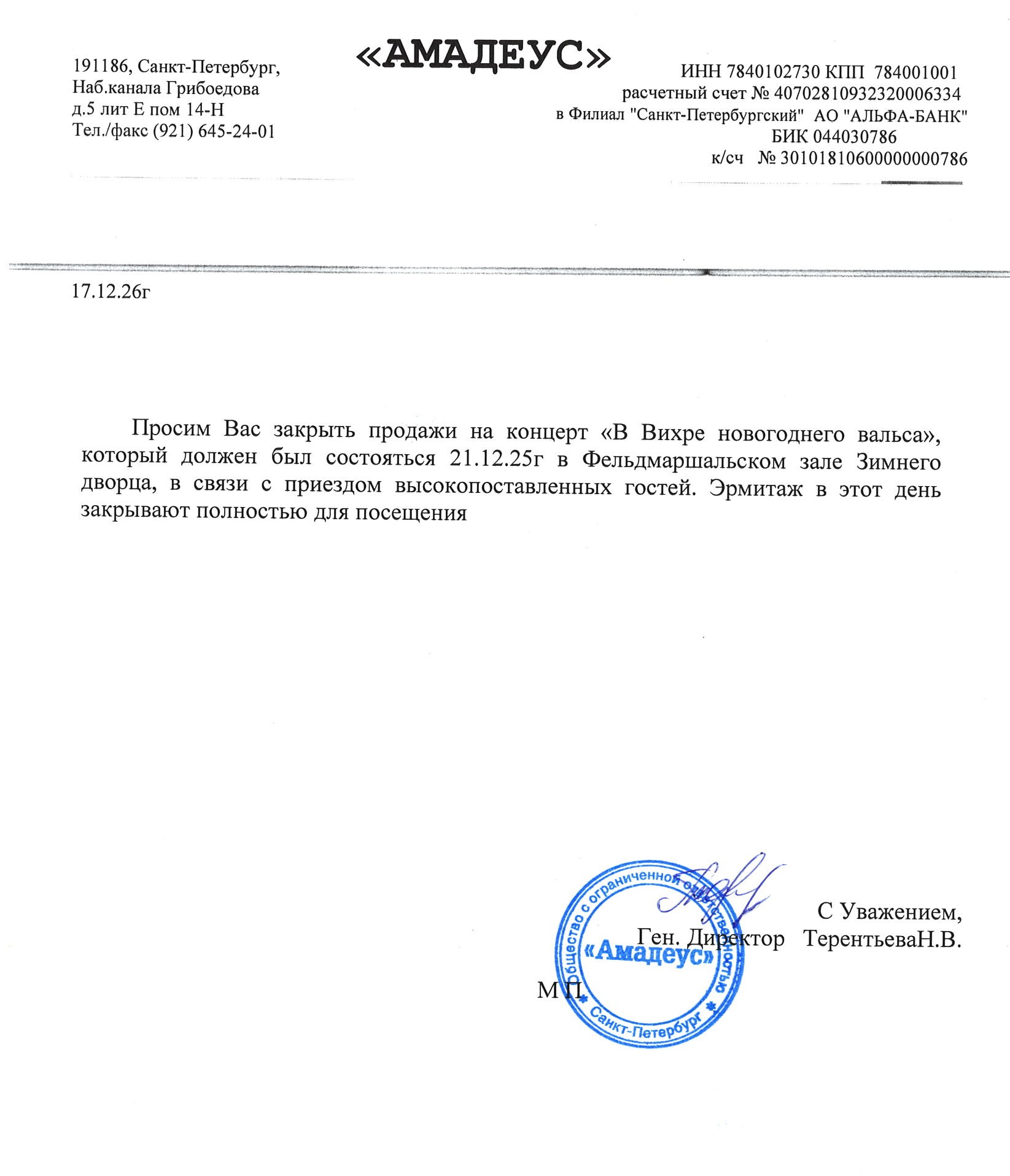 Уважаемый клиент! Спешим сообщить, что по информации, полученной от организатора, концерт «В вихре Новогоднего вальса», запланированный на 21 декабря 2025 года в 20:00 в Фельдмаршальском зале Зимнего дворца, отменён. Деньги за электронные билеты вернутся автоматически в полном объёме на карту, с которой была произведена оплата. Если вы купили билет в кассе Ticketland.ru за наличный расчет, то обратитесь, пожалуйста, на почту: vozvrat@ticketland.ru. С уважением, команда поддержки Ticketland.