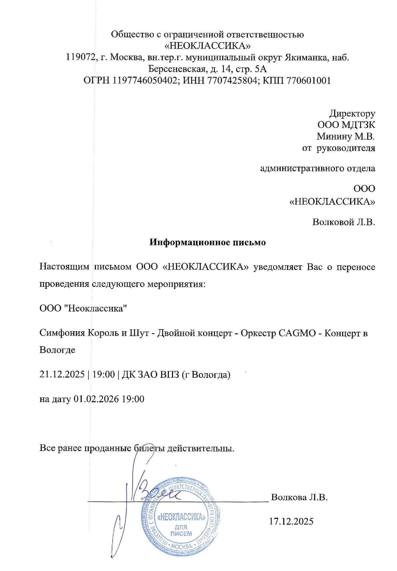 Уважаемый клиент! Спешим сообщить, что по информации, полученной от организатора, Двойной концерт «Оркестр CAGMO. Симфония Король и Шут», запланированный на 21 декабря 2025 года в 19:00 в ДК ЗАО ВПЗ, перенесён на 1 февраля 2026 года, начало в 19:00. Ранее приобретенные билеты действительны на новую дату, обменивать их не нужно. Если вам неудобно посетить концерт в новую дату, вы можете вернуть билет по кнопке в личном кабинете во вкладке «Заказы». Деньги за электронные билеты вернутся автоматически в полном объёме на карту, с которой была произведена оплата. Если вы купили билет в кассе Ticketland.ru за наличный расчет, то обратитесь, пожалуйста, на почту: vozvrat@ticketland.ru. С уважением, команда поддержки Ticketland.