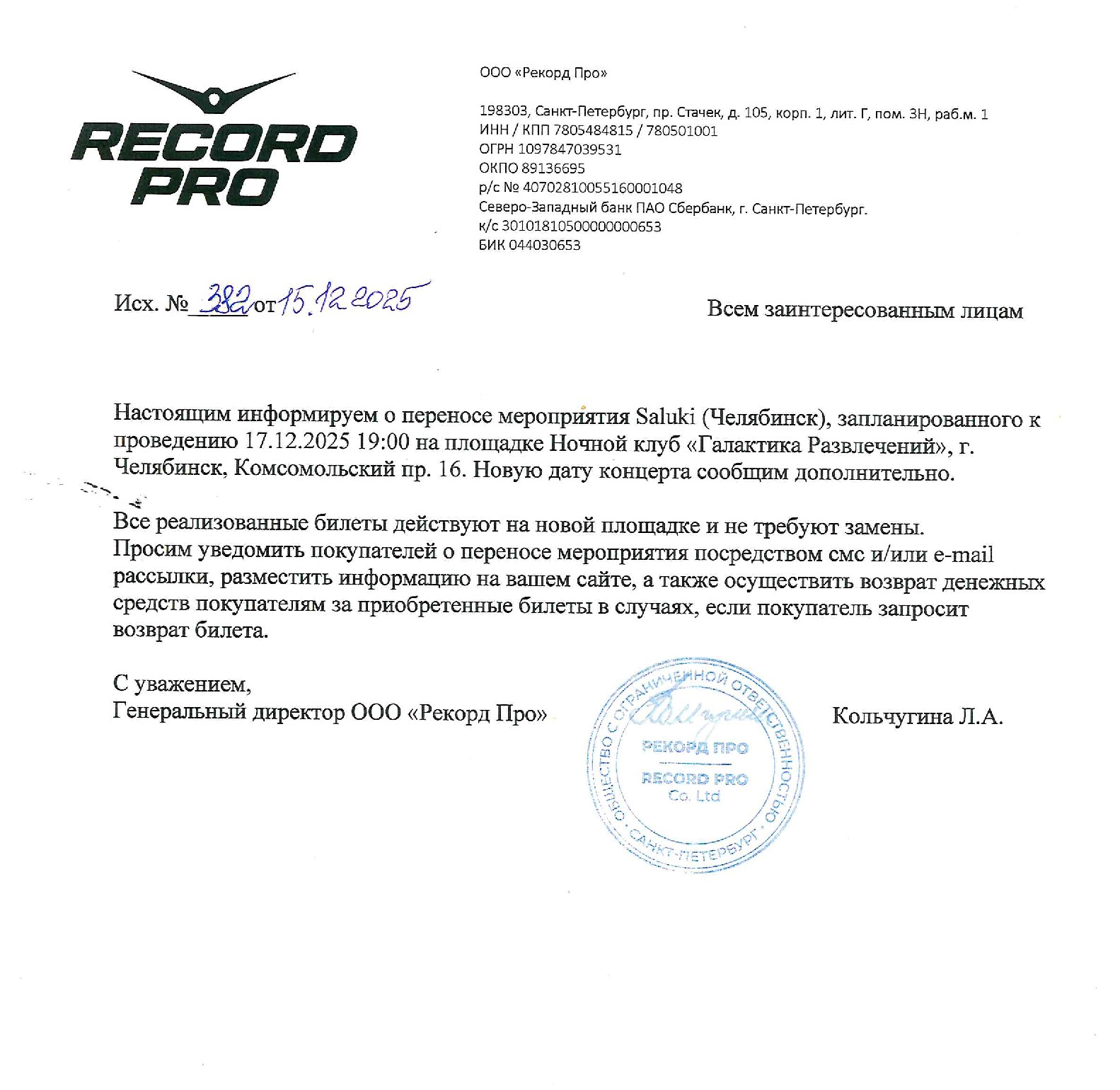 Уважаемый клиент! Спешим сообщить, что по информации, полученной от организатора, концерт Saluki, запланированный на 17 декабря 2025 года в 19:00 в клубе «Галактика развлечений», перенесён на открытую дату. Новая дата концерта будет объявлена дополнительно. Ранее приобретенные билеты действительны на новую дату, обменивать их не нужно. Если вам неудобно посетить концерт в новую дату, вы можете вернуть билет по кнопке в личном кабинете во вкладке «Заказы» (до 31 января 2026 года включительно). Деньги за электронные билеты вернутся автоматически в полном объёме на карту, с которой была произведена оплата. Если вы купили билет в кассе Ticketland.ru за наличный расчет, то обратитесь, пожалуйста, на почту: vozvrat@ticketland.ru. С уважением, команда поддержки Ticketland.